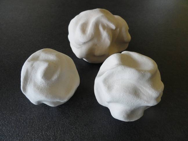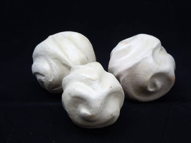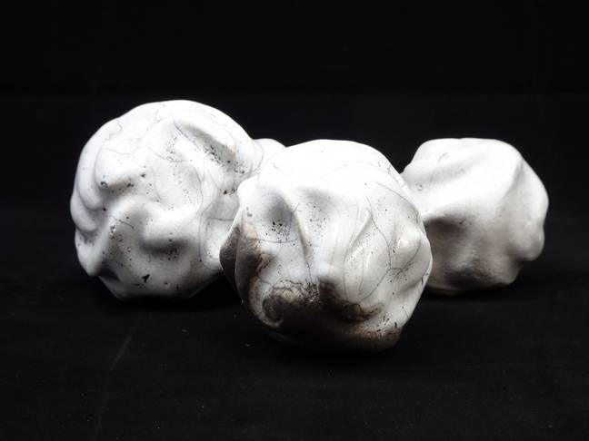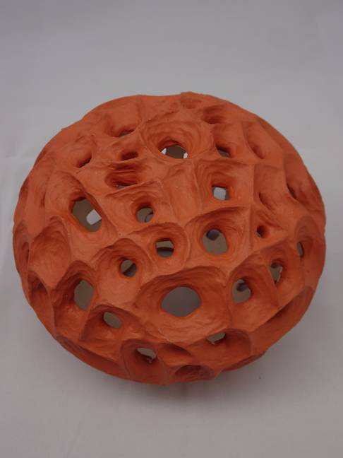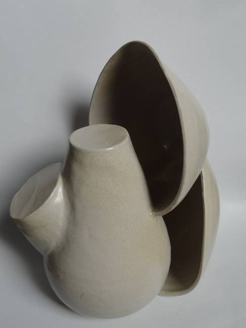 Vervolgens ga ik over tot assemblage: kleinere vazen transformeren tot eigenaardige sculpturen, semi-sferische kommen groeien uit tot grote bollen, en bolvormige vazen worden uitgeduwd en uitgesneden om nadien kleiplaten aan te brengen.