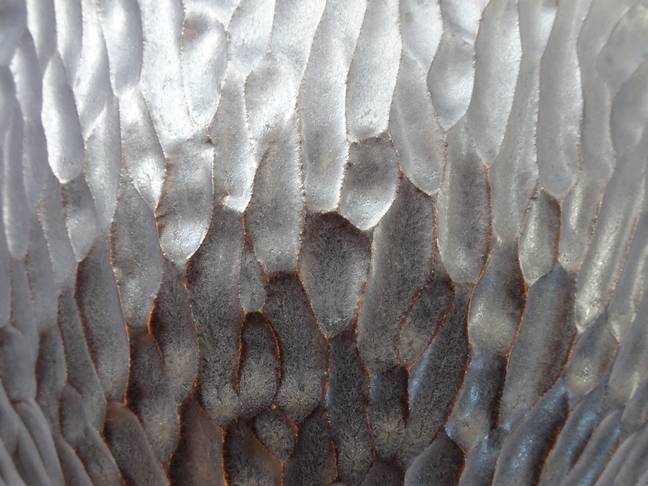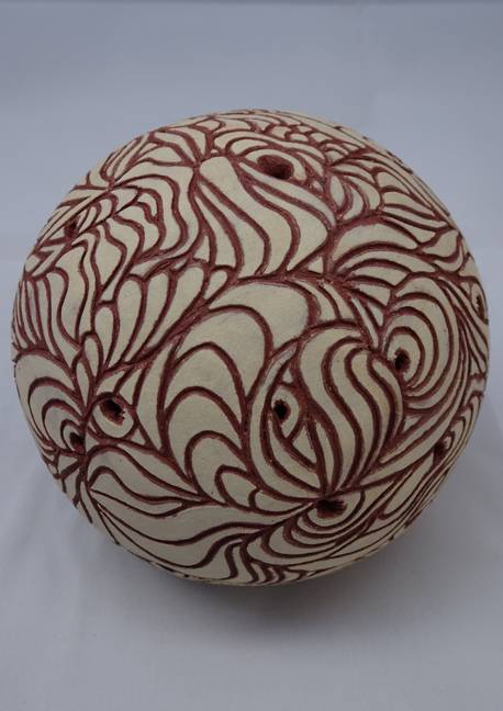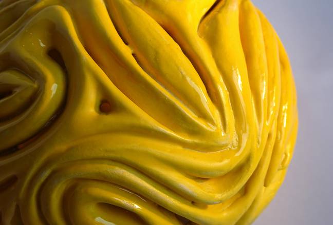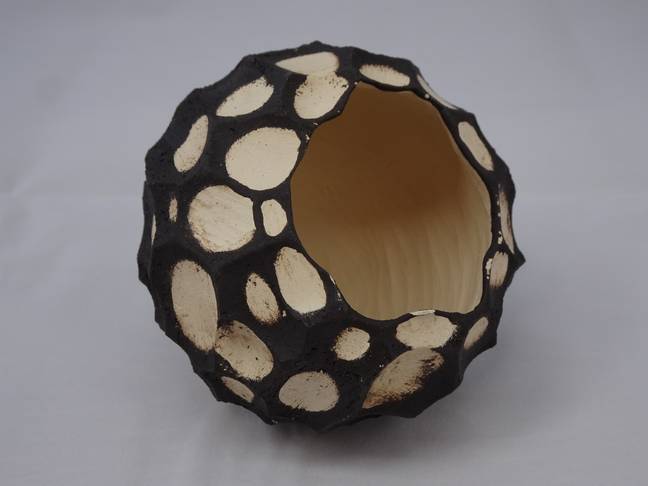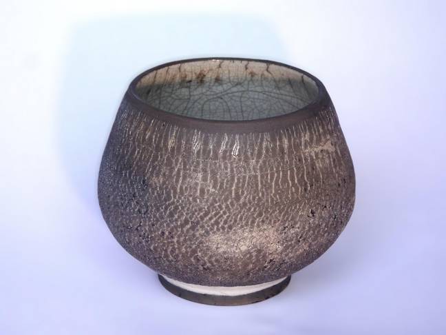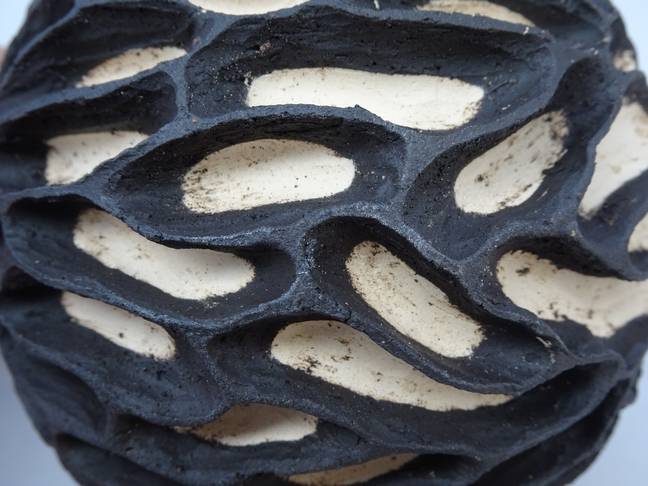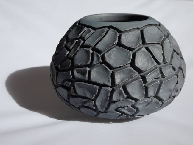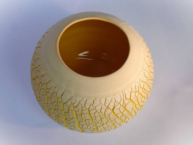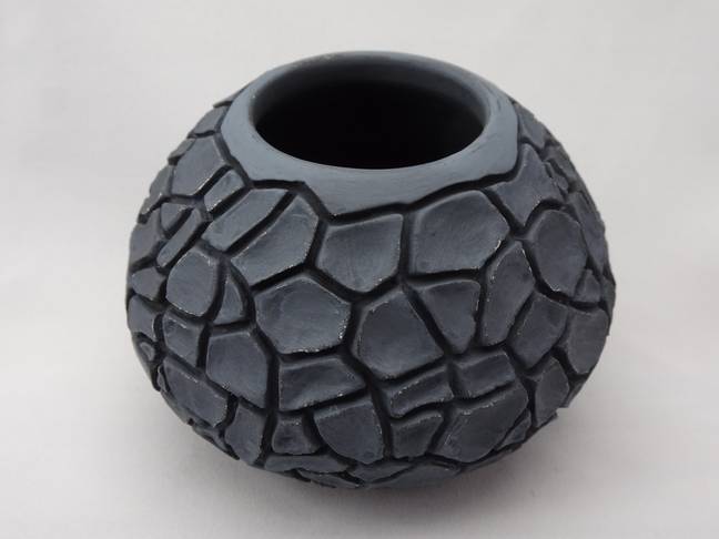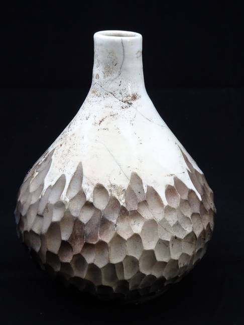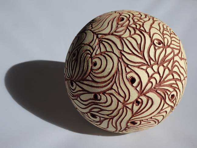 Het oppervlak wordt zorgvuldig bewerkt totdat de oorspronkelijke gladheid van de gedraaide klei niet meer herkenbaar is.