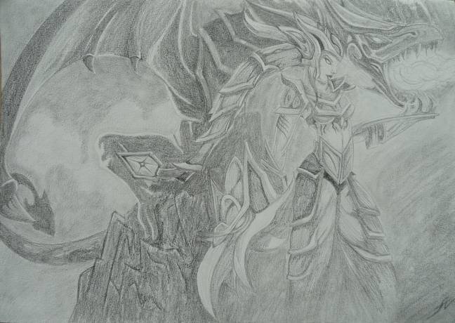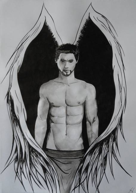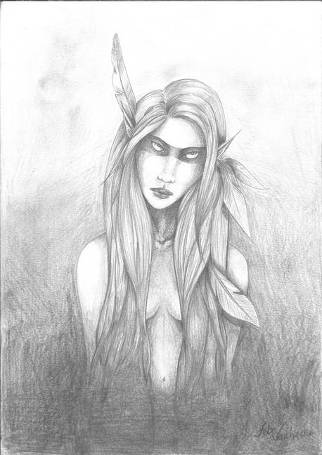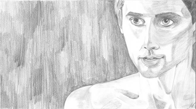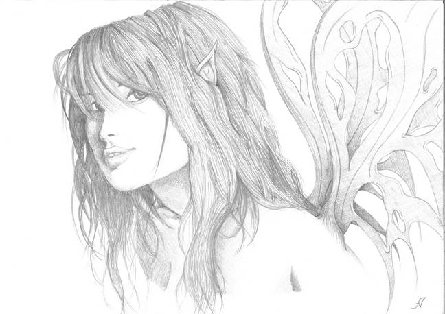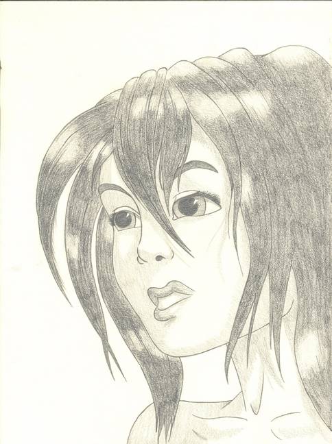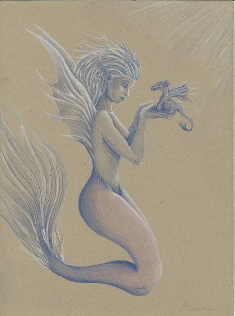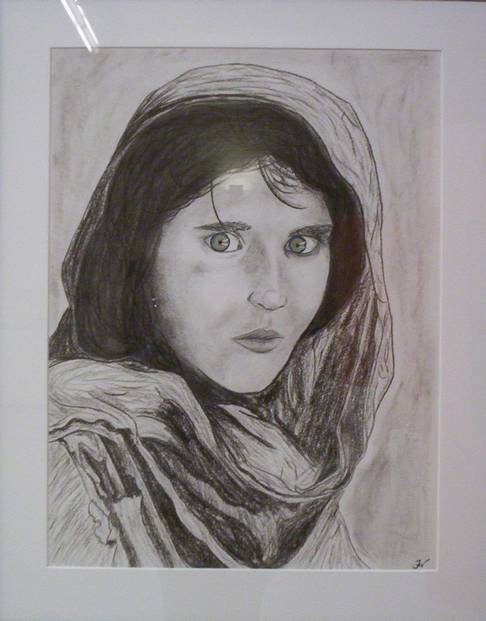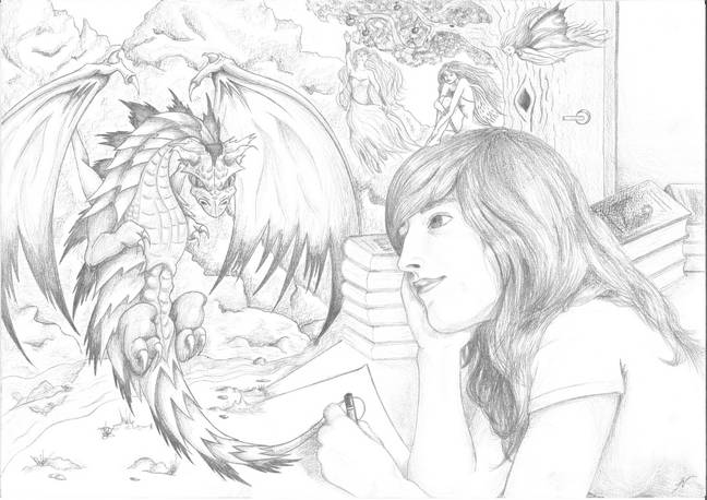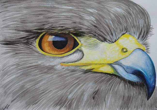 Tekening op grijs schetspapier met kleur- en schetspotloden 32x42